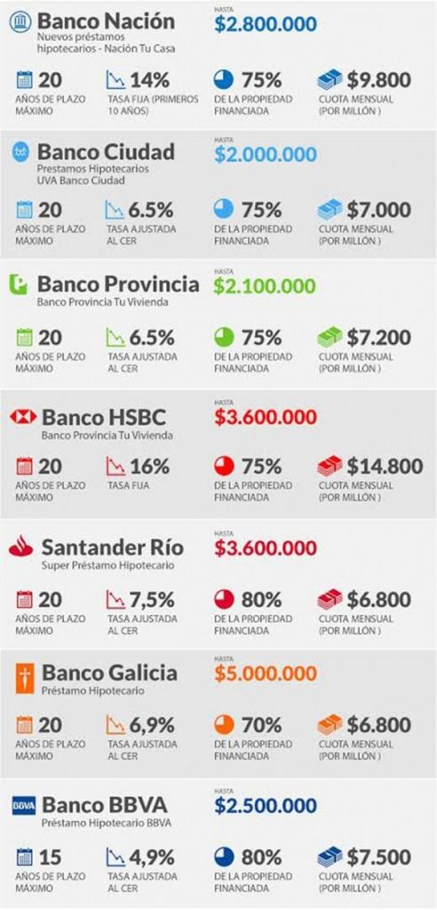 Una de las novedades es que por primera vez en la Argentina coexisten en el sistema cuatro variedades de créditos hipotecarios. La mayoría de los bancos otorga el indexado por UVA (Unidad de Valor Adquisitivo) mientras que otros bancos, como el HSBC, otorgan el tradicional a tasa fija. El Banco Nación da créditos indexados por el CVS (Coeficiente de Variación Salarial) y el Banco Hipotecario junto a algunos privados y públicos ofrecen el Procrear, que se modificará en los próximos días.